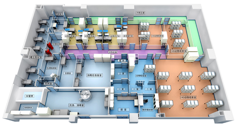 動(dòng)物實(shí)驗(yàn)室一般由飼養(yǎng)室、健康觀察室、隔離檢疫室、各種實(shí)驗(yàn)室(外科手術(shù)、實(shí)驗(yàn)處理解剖、術(shù)后管理、疾病診斷、治療、生理生化檢查、微生物檢疫、飼料營養(yǎng)分析和特殊飼料的調(diào)制室等),以及貯藏室、清潔準(zhǔn)備室、洗滌消毒室、工作人員用房(包括辦公室、淋浴室、更衣室等)、走廊(清潔區(qū)和污染區(qū))、廢棄物處理設(shè)施、機(jī)房和變電所等組成。